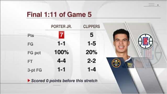 快速比分9月12日讯 掘金在今日比赛中111-105击败快船,目前他们大比分2-3落后对方。赛后,掘金前锋小迈克尔-波特接受了采访。 谈到自己末节关键时刻