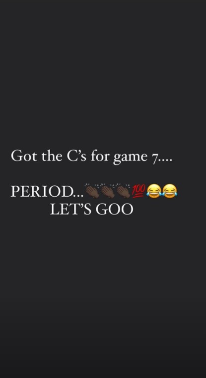 快速比分9月12日讯 今日,NBA名宿凯文-加内特更新了个人Instagram Story,为凯尔特人加油。 加内特写道:“凯尔特人抢七加油……句号……