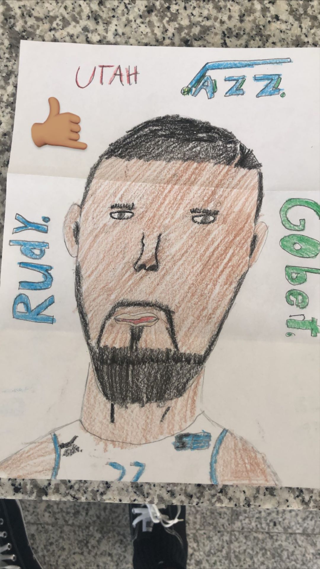 快速比分9月12日讯 今日,爵士中锋鲁迪-戈贝尔更新了个人Instagram Story,转发了一张爵士小球迷为他创作的肖像画。 戈贝尔季后赛场均出场38