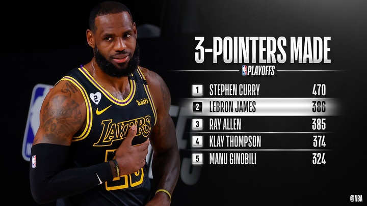 勒布朗季后赛三分命中数成功超越雷-阿伦,独占历史第二