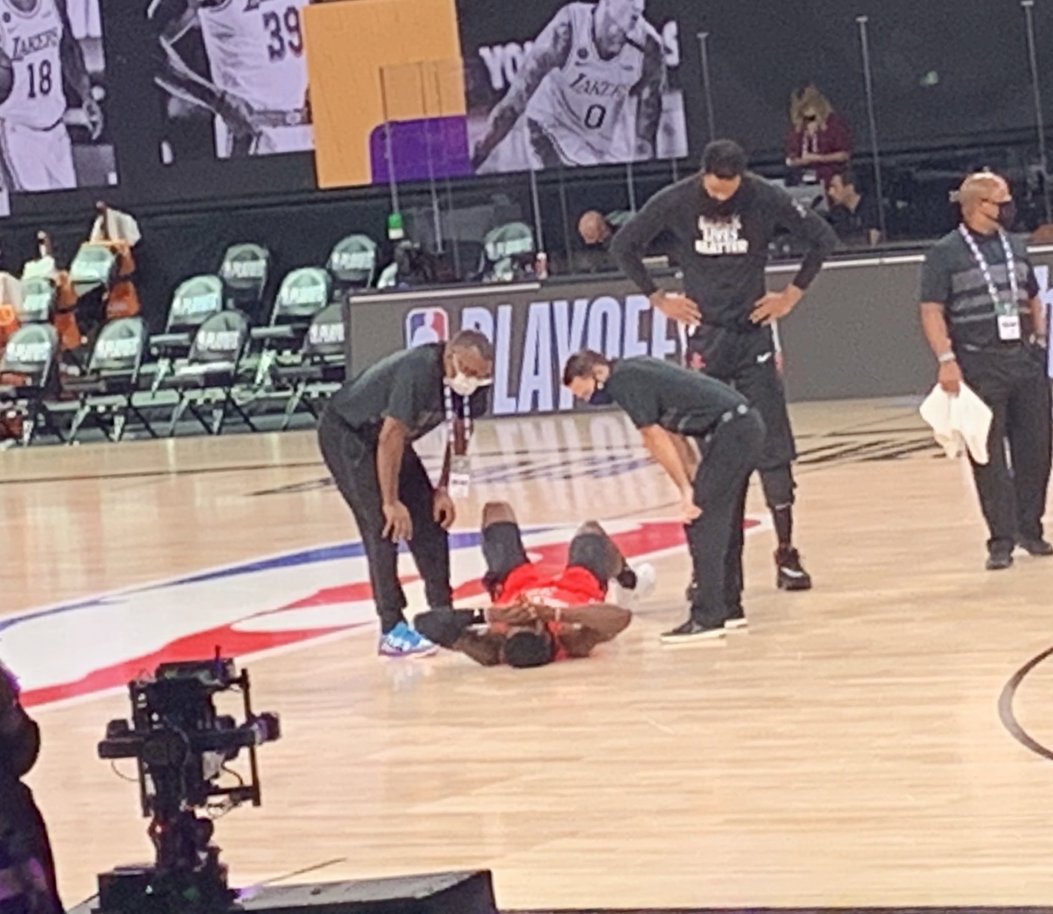 快速比分9月7日讯 今天湖人对阵火箭的比赛上半场结束,湖人67-51领先火箭。 第二节末尾,火箭前锋杰夫-格林在防守安东尼-戴维斯时受伤倒地,直到半场结束