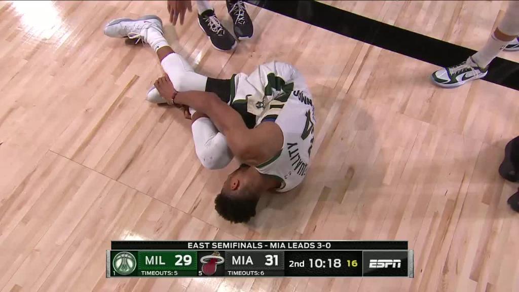 快速比分9月7日讯 雄鹿与热火的系列赛第四场比赛正在进行中,目前热火系列赛大比分3-0领先。 比赛进行到第二节时,雄鹿前锋扬尼斯-阿德托昆博在一次进攻中被