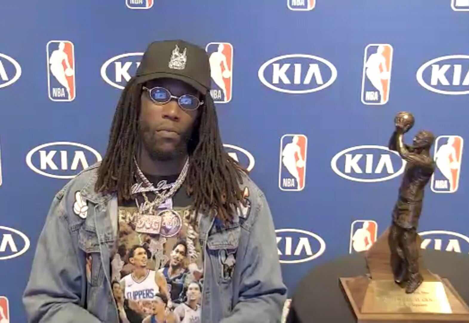 快速比分9月5日讯 根据此前的报道,快船前锋蒙特雷兹-哈勒尔当选本赛季最佳第六人。 今日,哈勒尔在领取最佳第六人奖杯的时候穿着一件印有快船后卫路易斯-威廉
