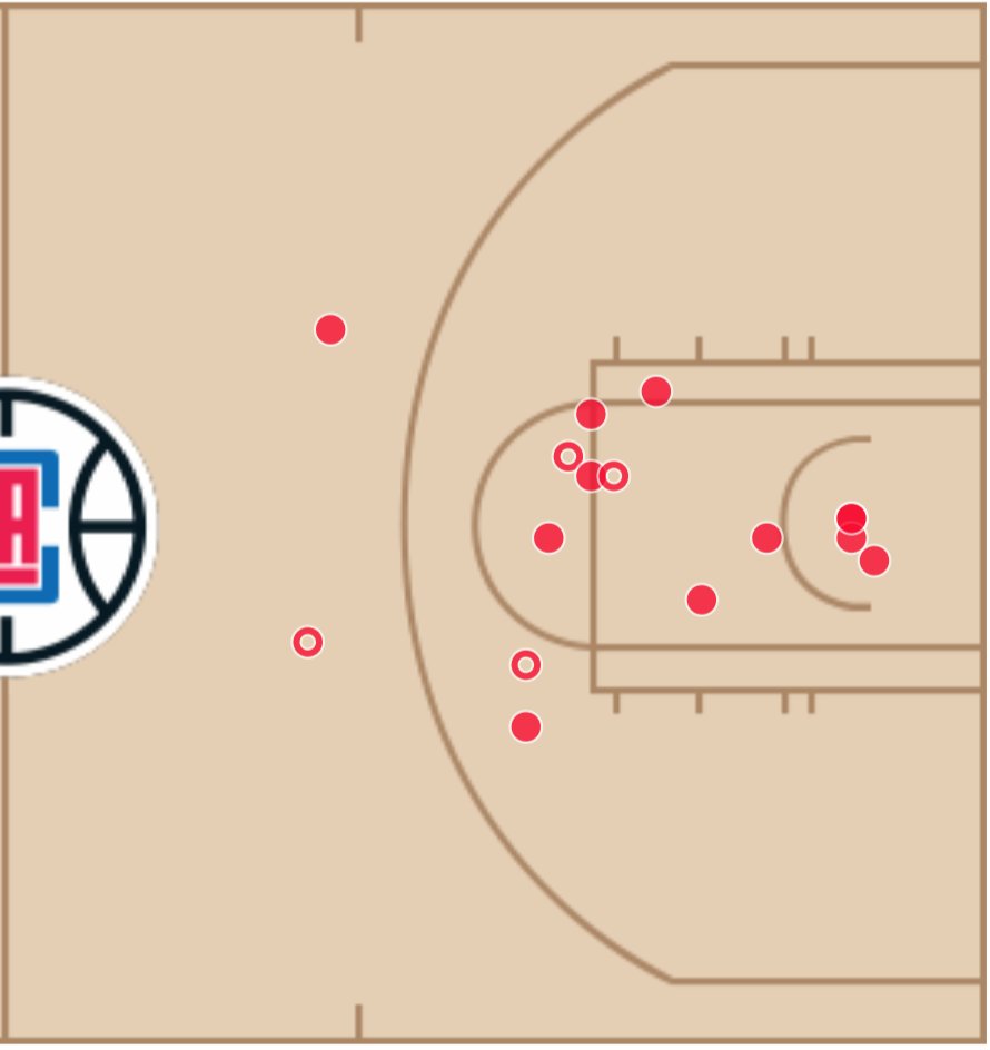 快速比分9月4日讯 在今日结束的NBA比赛中,快船120-97击败掘金,系列赛1-0领先。 赛后媒体发布了快船前锋科怀-伦纳德本场的投篮分布图。 本