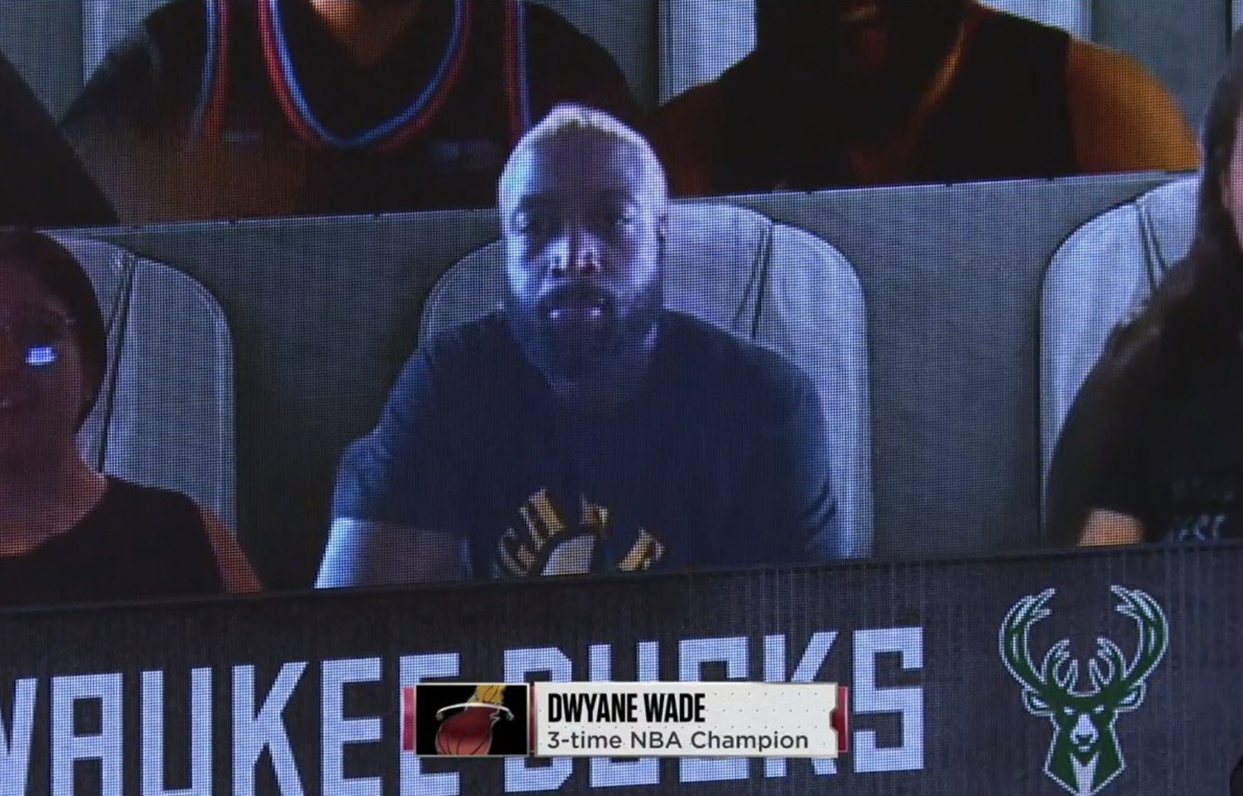 韦德现身热火与雄鹿G2的现场球迷虚拟大屏