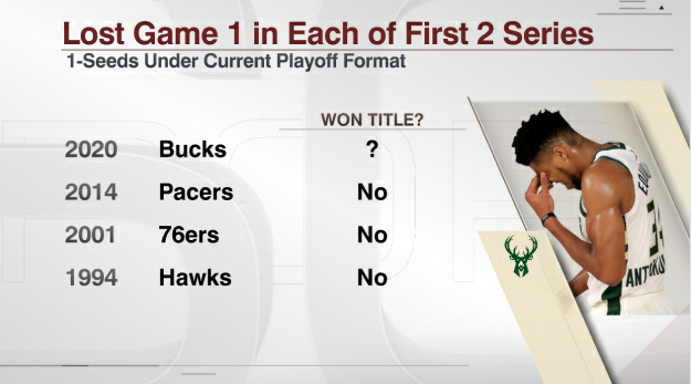 雄鹿是历史第四支季后赛前两轮首战均告负的分区头号种子