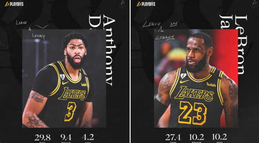 快速比分9月1日讯 在此前的系列赛中,湖人总比分4-1战胜了开拓者晋级西部半决赛。 今日,湖人官推晒出了球队主力安东尼-戴维斯和勒布朗-詹姆斯在第一轮的数