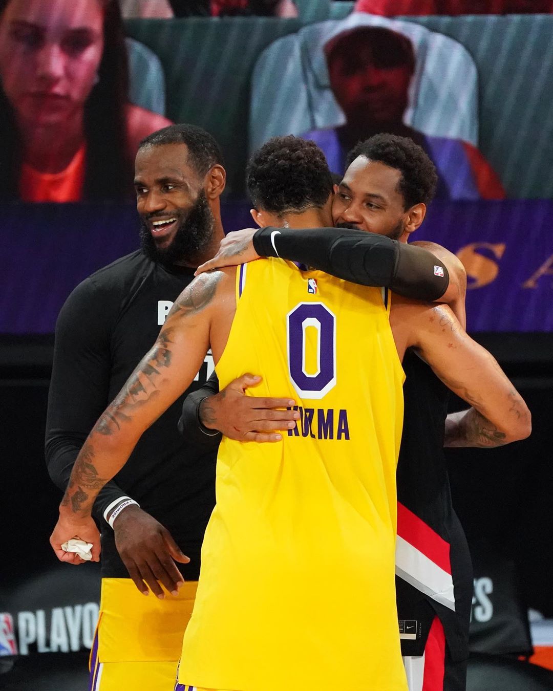 快速比分8月31日讯 今日,湖人球员凯尔-库兹马更新了个人Instagram,晒出昨日自己与开拓者前锋卡梅罗-安东尼拥抱的赛场照。 库兹马写道:“唯有爱意