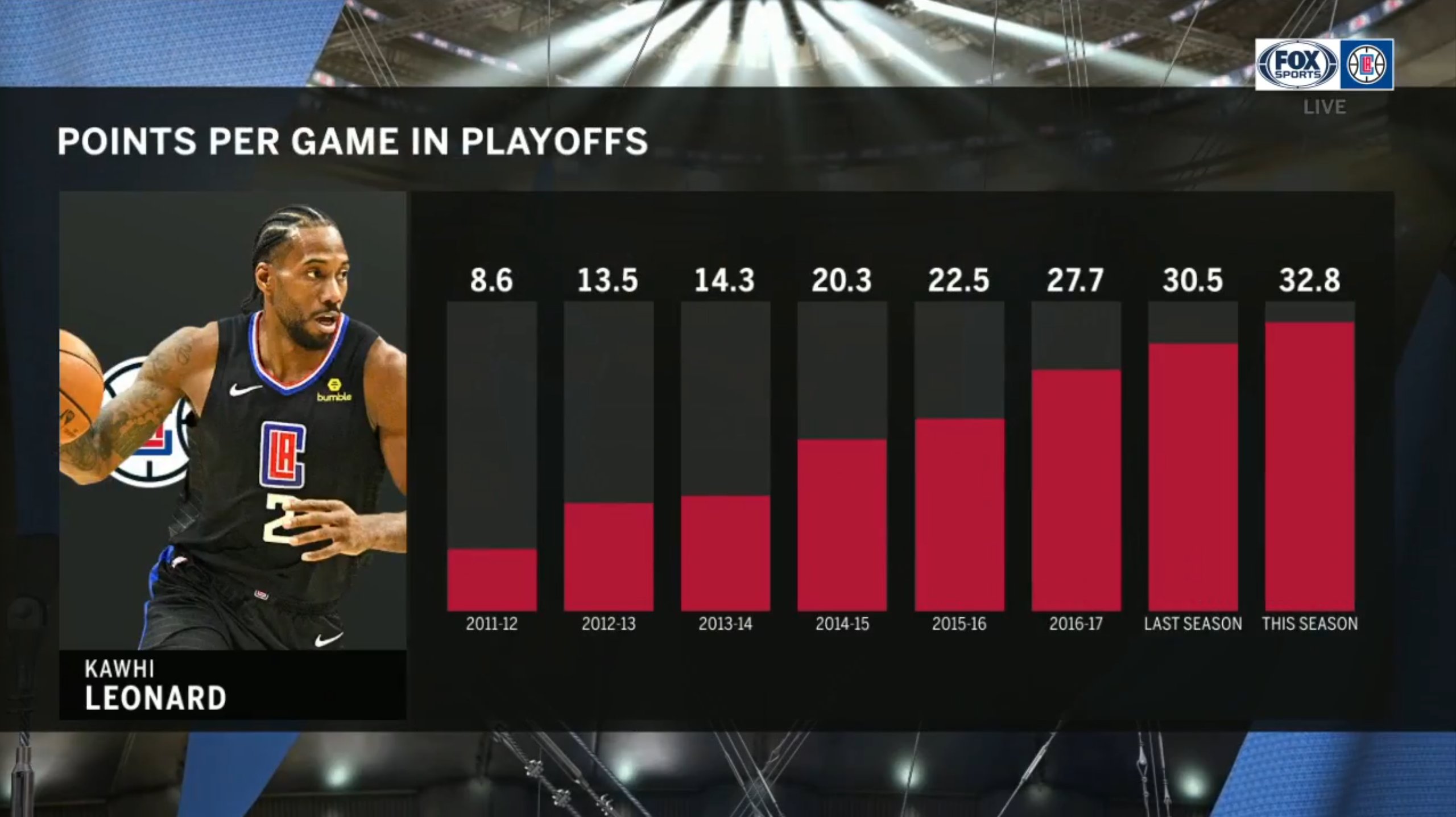 记者晒伦纳德生涯季后赛场均得分,每一年都稳步提升
