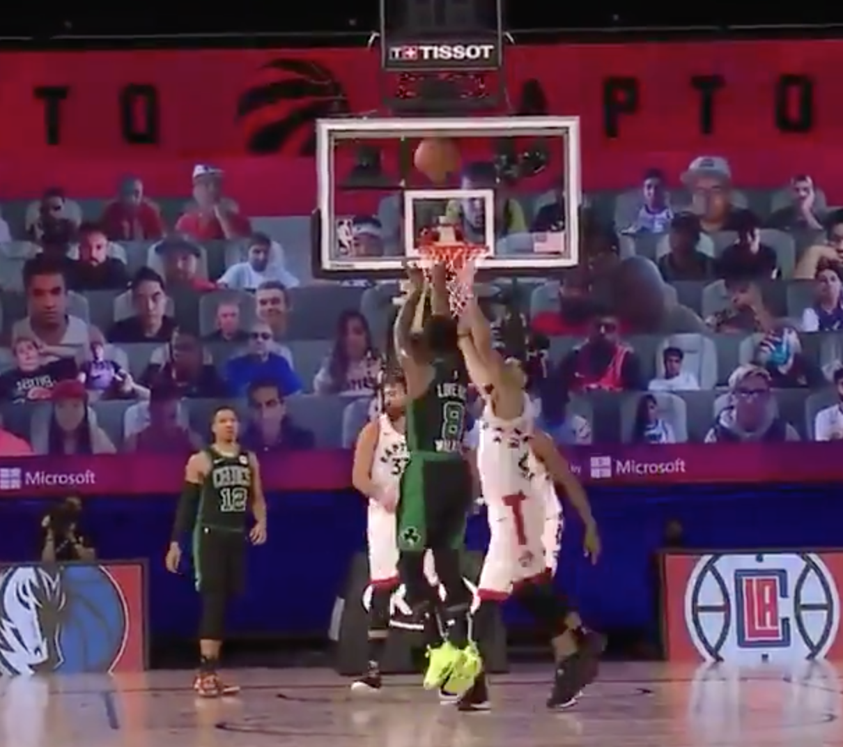 快速比分8月31日讯 在今天正在举行的比赛中,凯尔特人与猛龙的比赛正激战正酣。赛中House of Highlights更新推特,晒出肯巴-沃克中场的压哨三分。