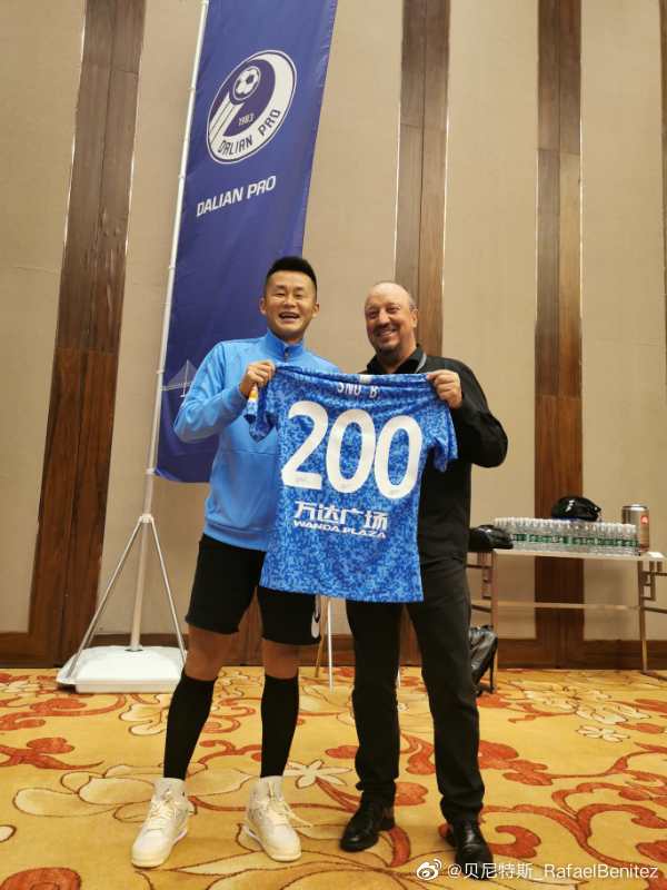 快速比分9月4日讯 今天,大连人主帅贝尼特斯在微博晒出合影,庆祝孙铂完成200场里程碑。 昨天大连人4-0大胜建业的比赛,孙铂完成了他在大连人的200场比