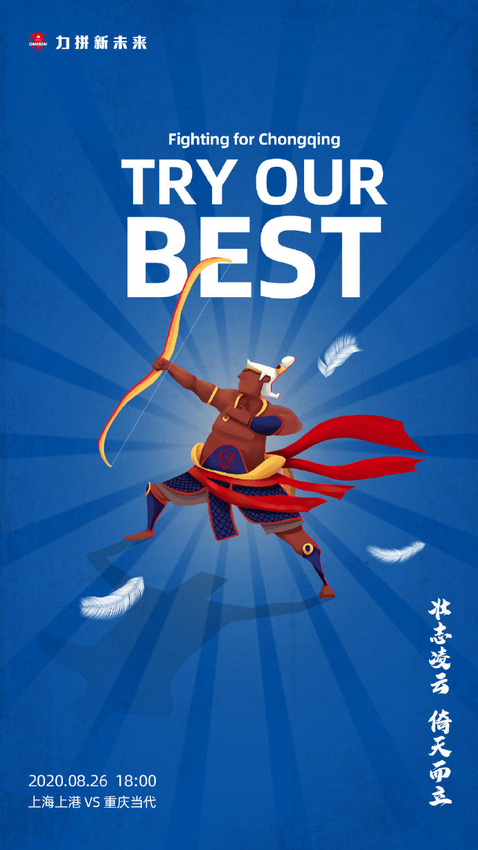 快速比分8月25日讯 今天,重庆当代队发布了中超第7轮对阵上海上港的海报《Try our best》。 海报中重庆当代队化身为了一名弓箭手的形象,海报上方